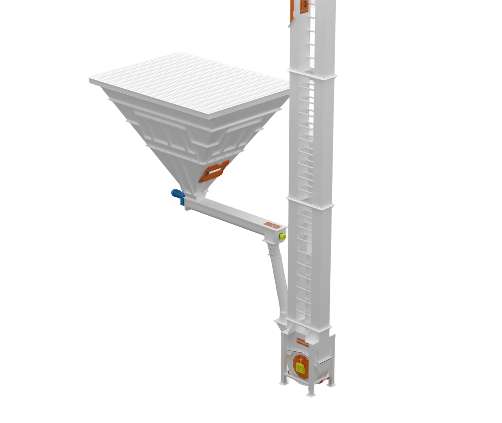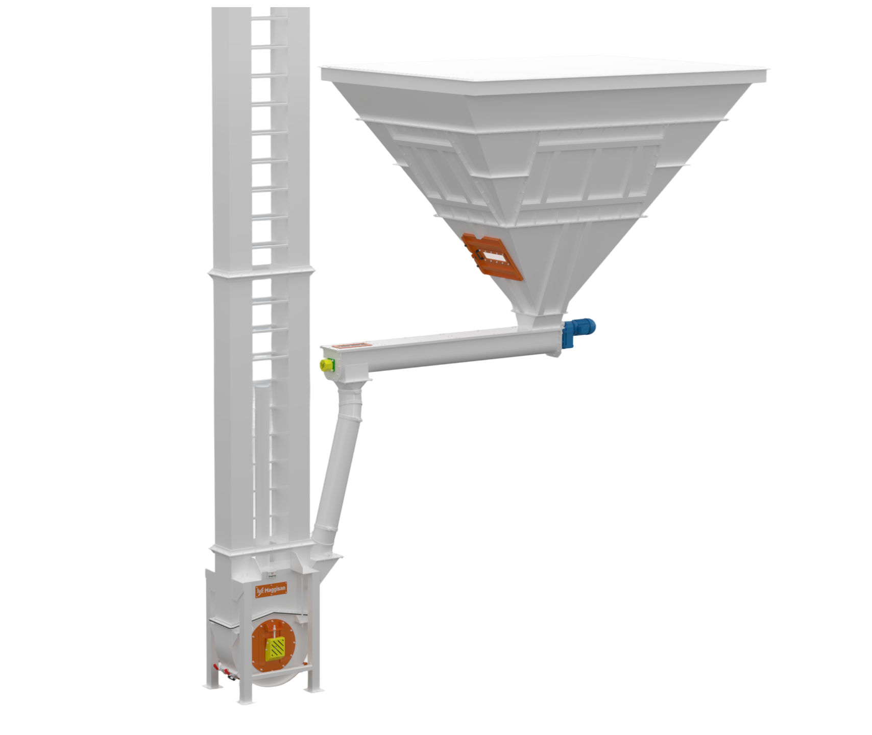 O caminhão descarrega diretamente na moega, estruturada em vigas laminadas. O material é direcionado por transportadores ou roscas, conforme a operação. Portas de inspeção garantem facilidade de acesso para manutenção.