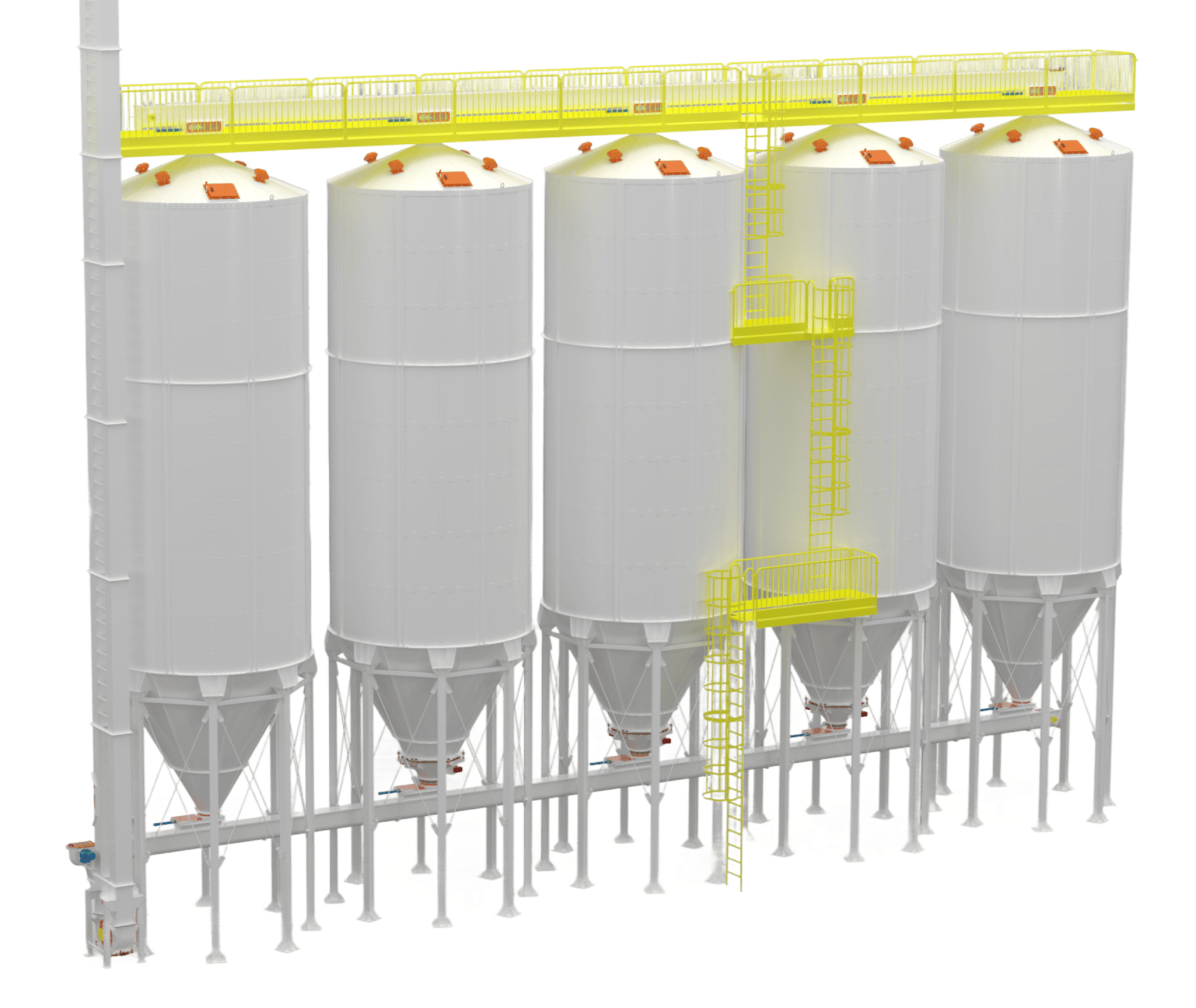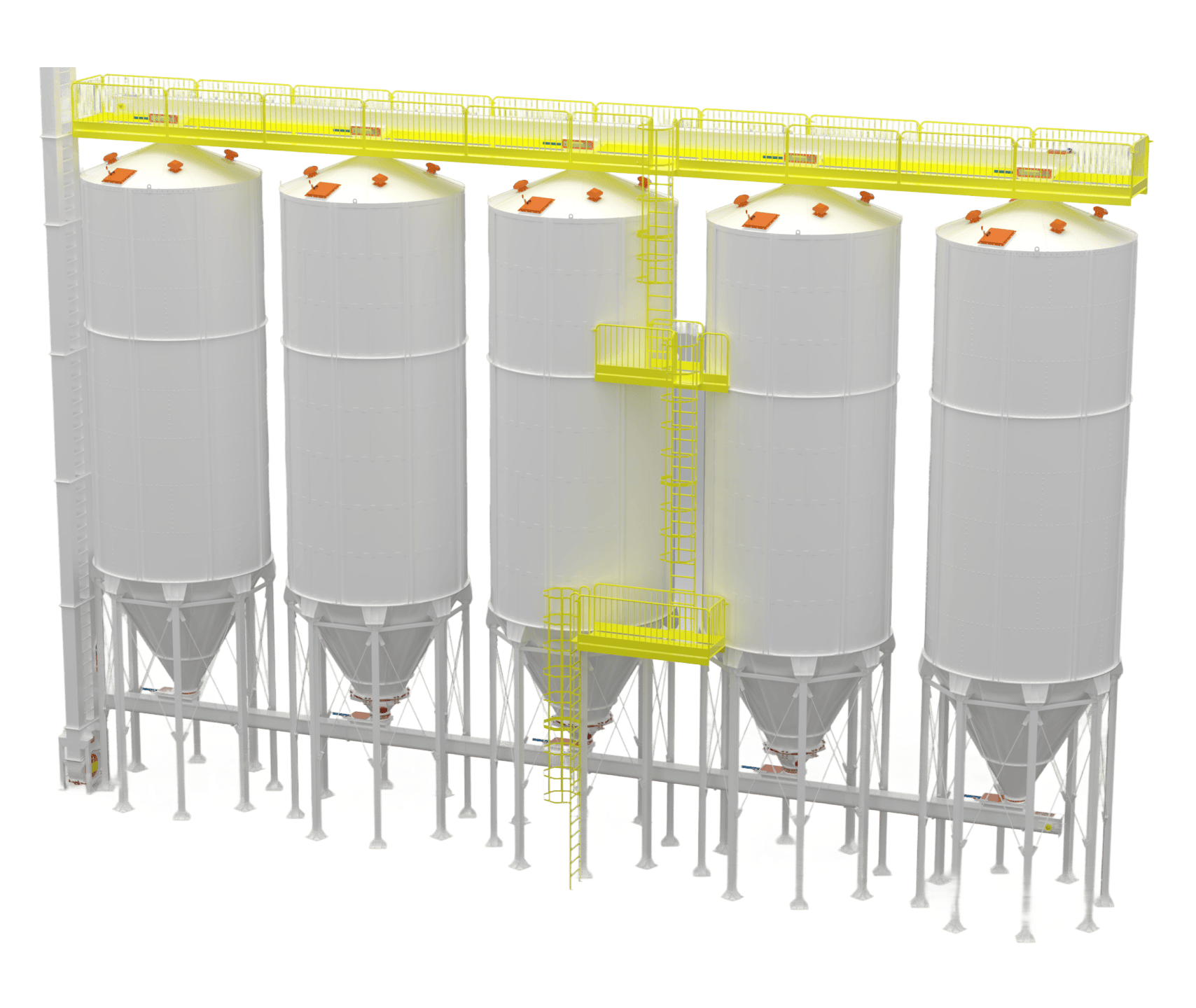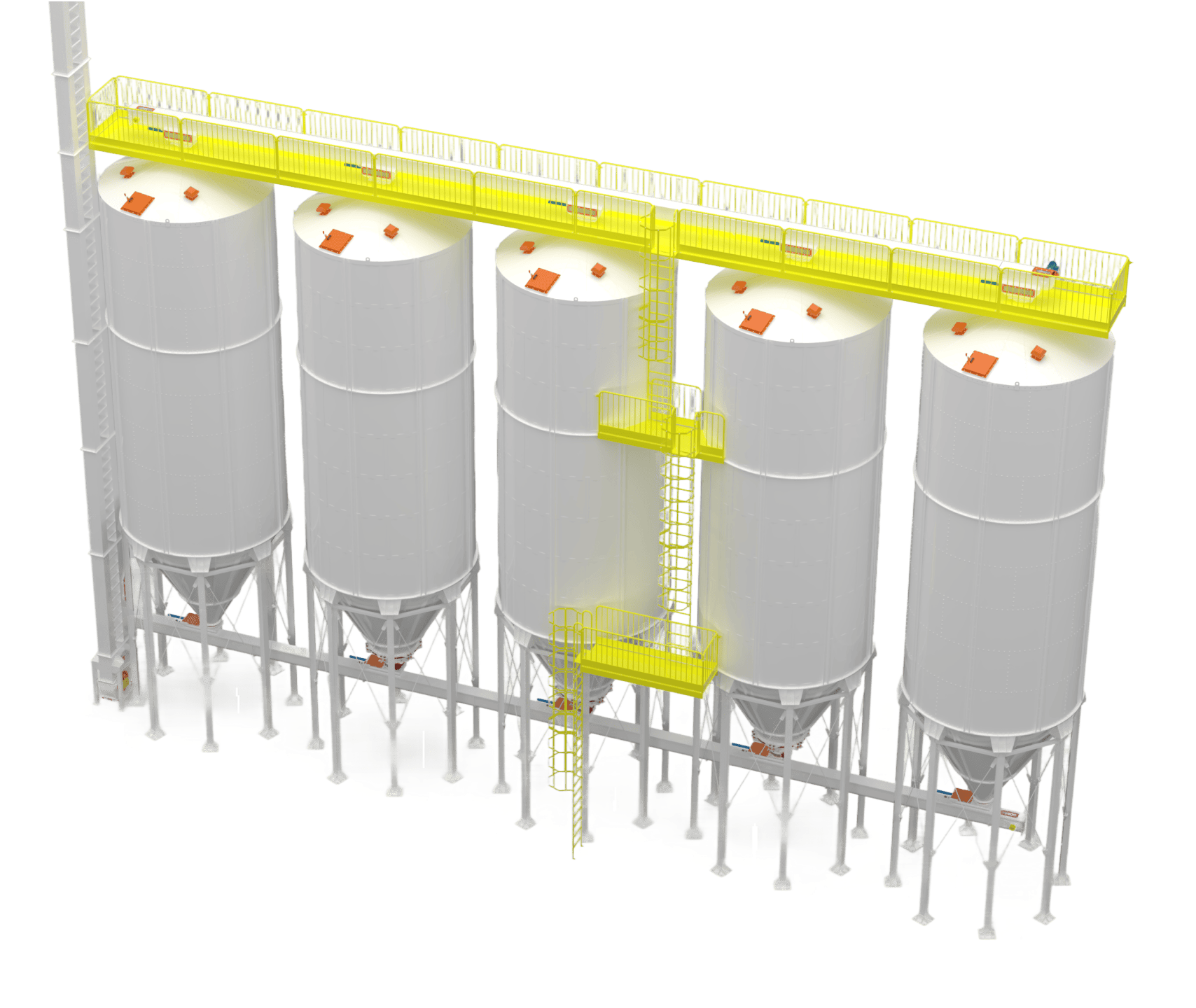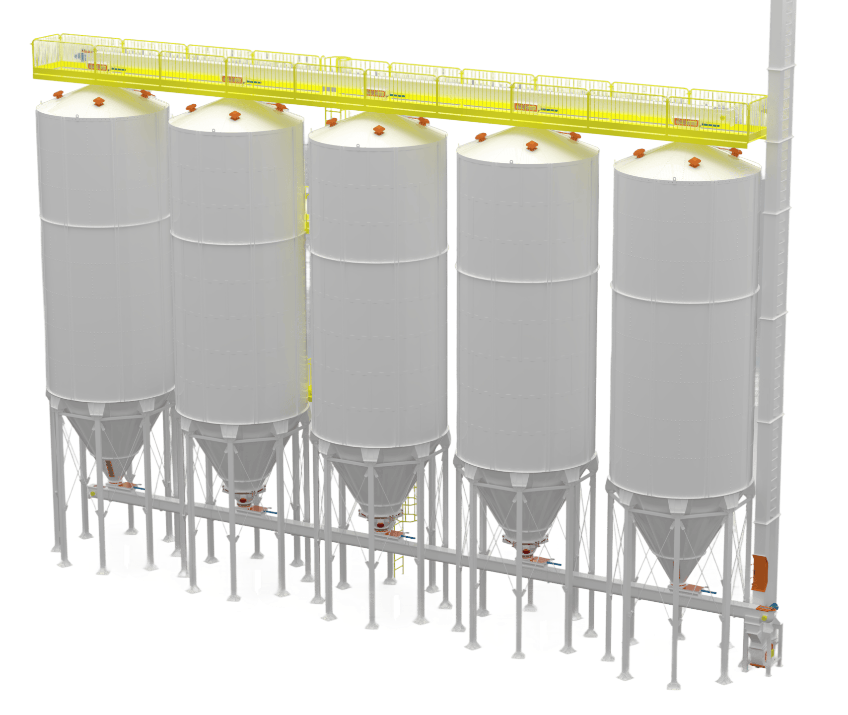 • Silos Externos: Projetados para resistirem às intempéries climáticas (sol, chuva, vento), dispensam cobertura e são comumente utilizados em unidades agrícolas ou industriais para o armazenamento de grãos e farelos em grande volume. Possuem reforços estruturais e acabamento anticorrosivo específico.