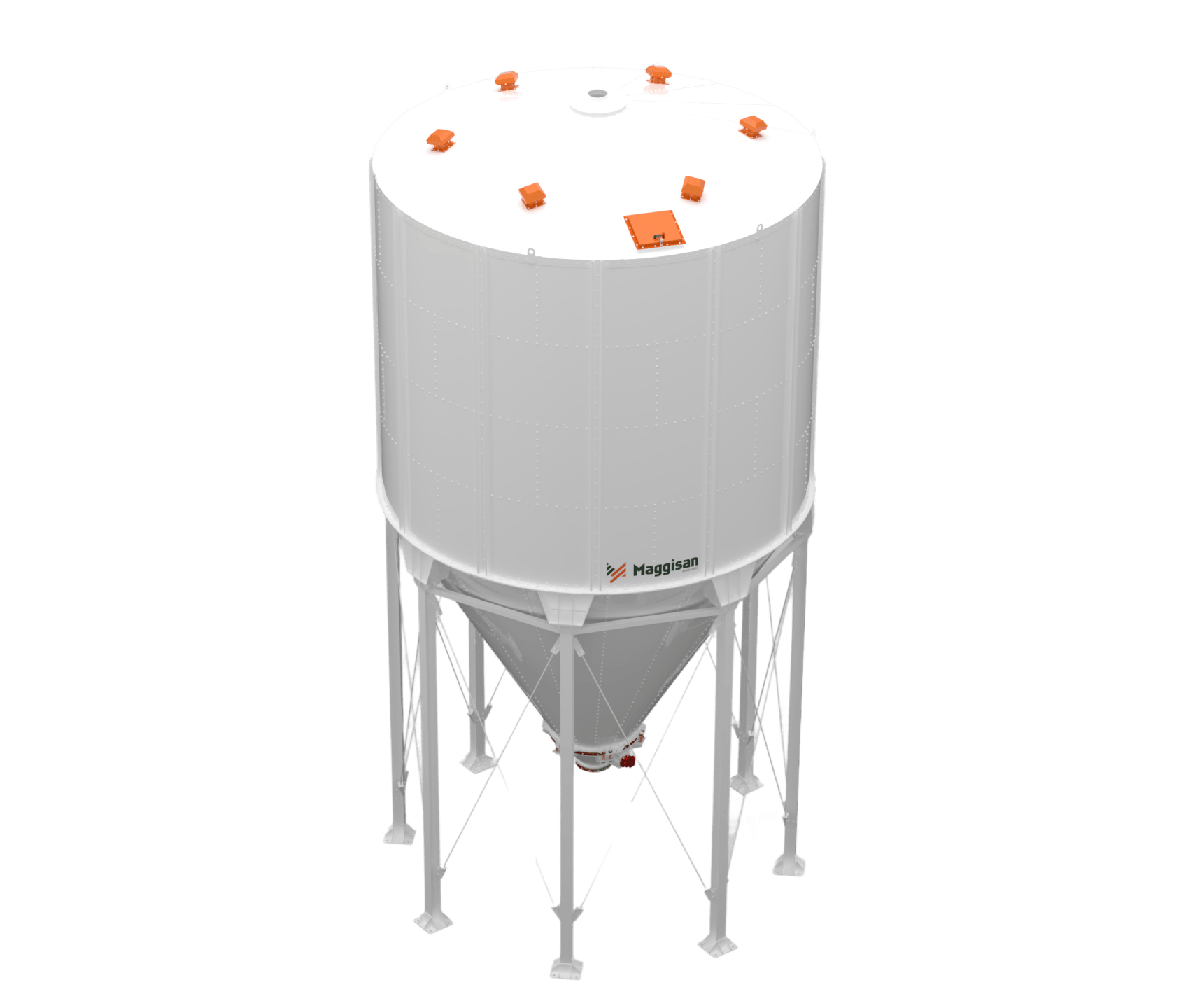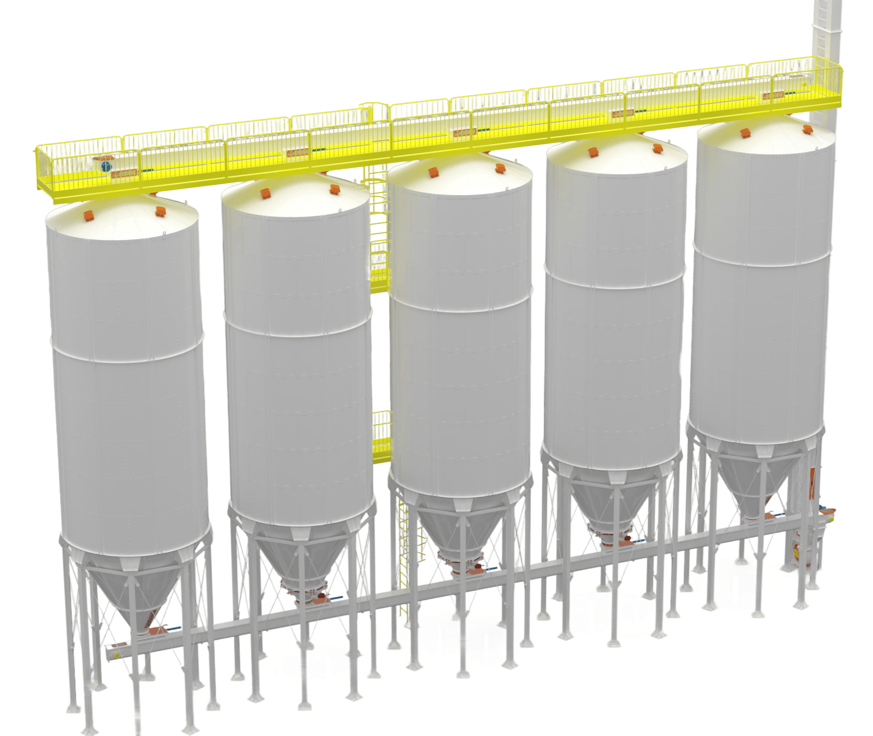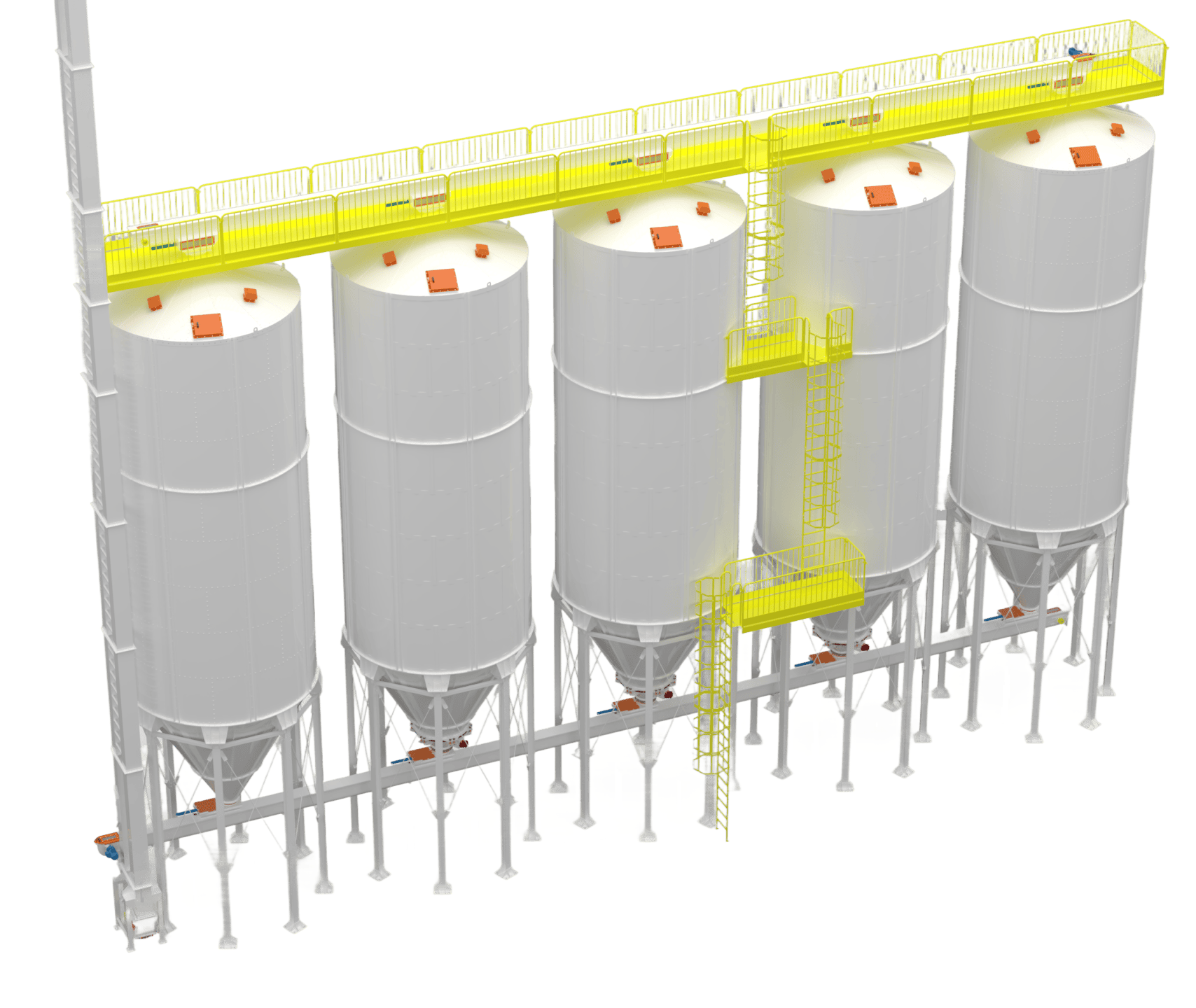 • Silos Externos: Projetados para resistirem às intempéries climáticas (sol, chuva, vento), dispensam cobertura e são comumente utilizados em unidades agrícolas ou industriais para o armazenamento de grãos e farelos em grande volume. Possuem reforços estruturais e acabamento anticorrosivo específico.