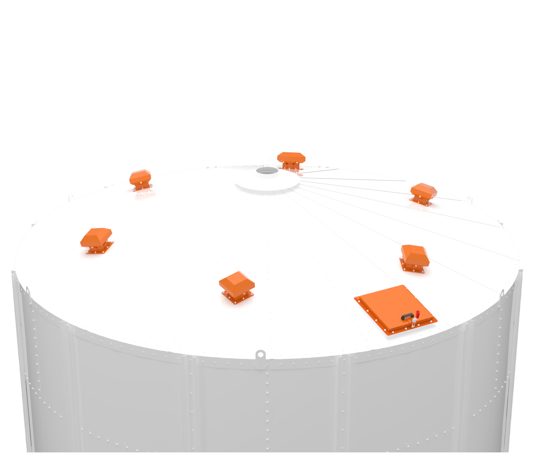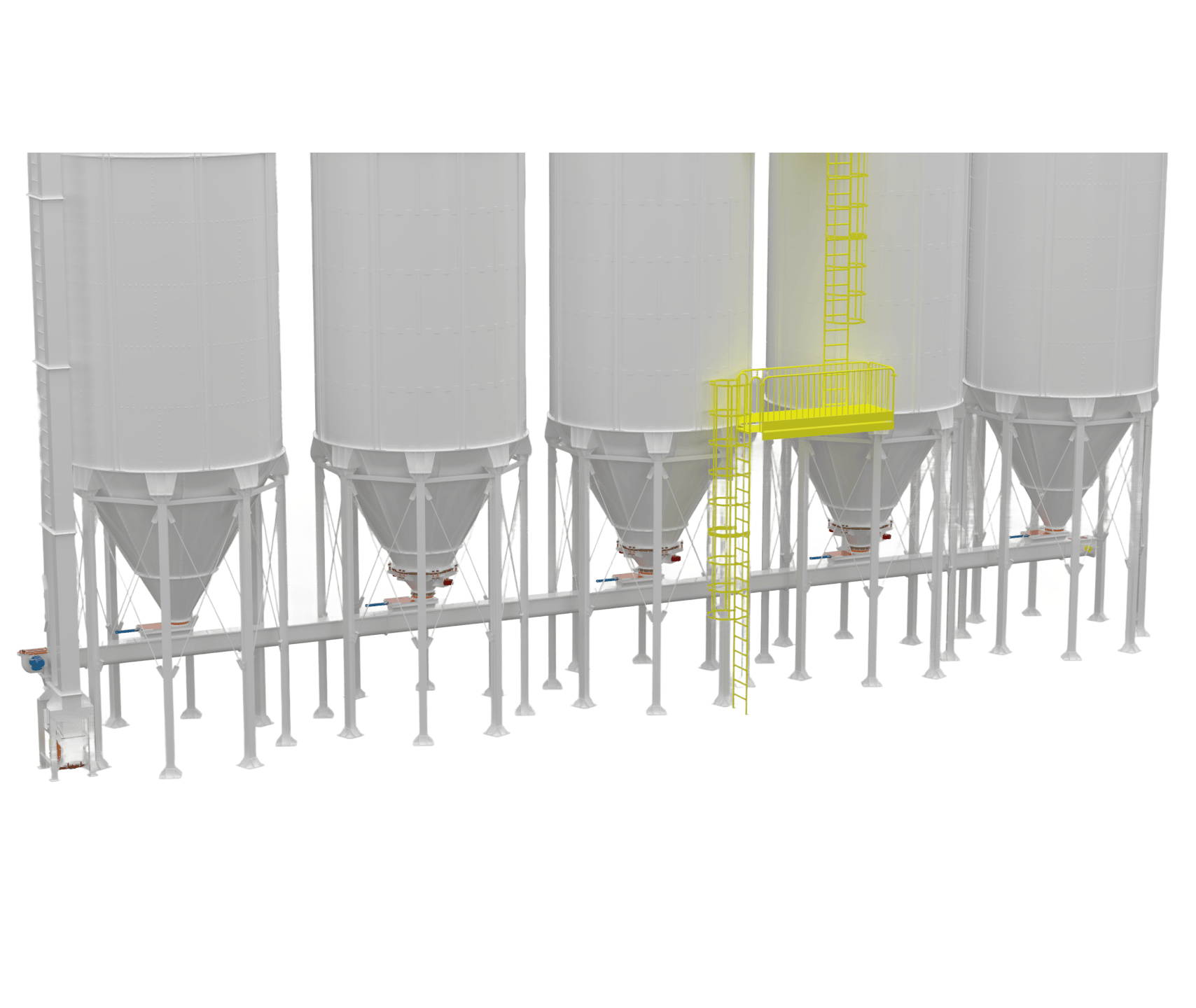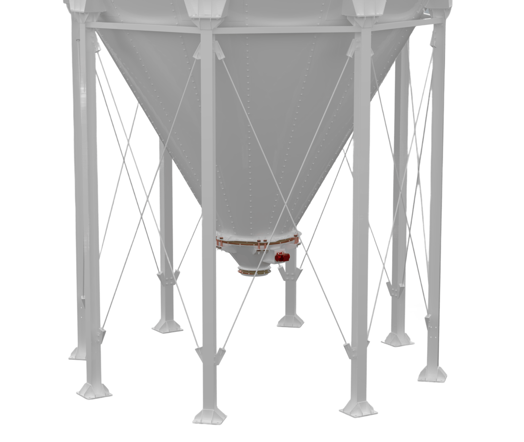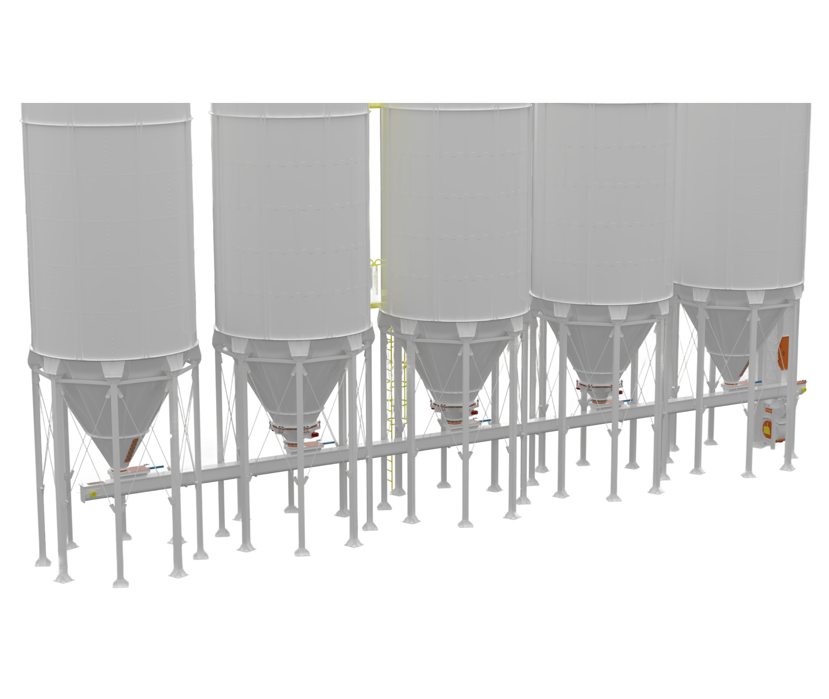 • Silos Externos: Projetados para resistirem às intempéries climáticas (sol, chuva, vento), dispensam cobertura e são comumente utilizados em unidades agrícolas ou industriais para o armazenamento de grãos e farelos em grande volume. Possuem reforços estruturais e acabamento anticorrosivo específico.