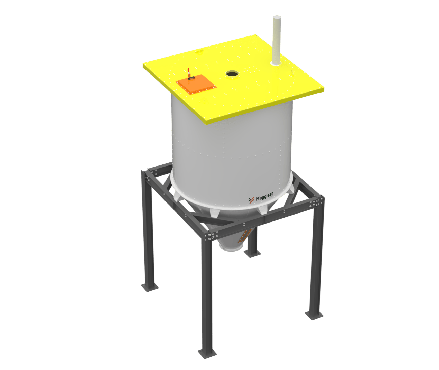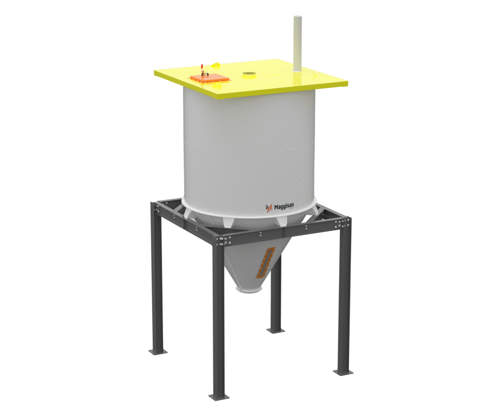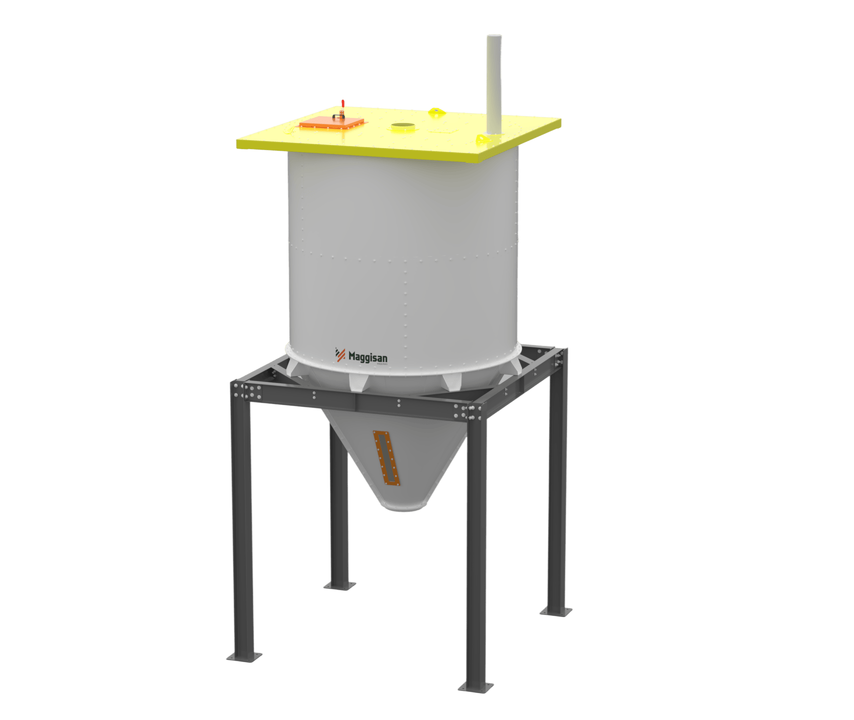 Produto armazenado em corpo cilíndrico ou retangular. Escoamento facilitado por fundo funilado, por gravidade ou transportadores. Versão flangeada evita acúmulo de resíduos.